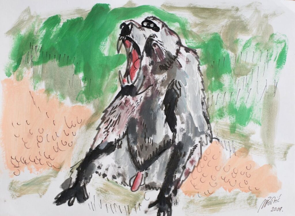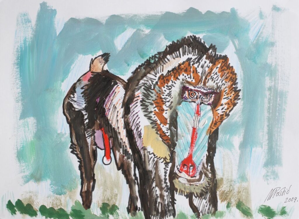Изложени цртежи настали су у комбинованој техници, углавном оловком на папиру, током трогодишњег боравка у Јужној Африци, двогодишњег у Јужној Кореји и једногодишњег на Јужном Тајланду. Најзаступљенији су прикази антропоморфних мајмуна, који показују предности оба блиска рођака – природне емоције и став мајмуна, као и кицошку потребу за дотеривањем и самоистицањем човека. Формати цртежа су различити, а већина до сада није излагана, осим у дигиталној форми на сајту miletapostic.blogspot.com под рубриком Drawings.