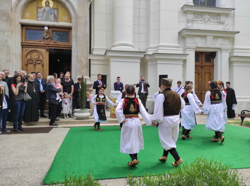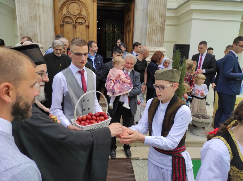 Након свете архијерејске литургије на први дан Васкрса у Саборној цркви у Сремским Карловцима, малишани Омладинског културно-уметничког друштва „Бранково коло” приредили су мали фолклорни спектакл на радост свих присутних. Након наступа даривани су црвеним јајетом од стране Његовог преосвештенства епископа сремског г. Василија.Текст и фото: В. Раонић;