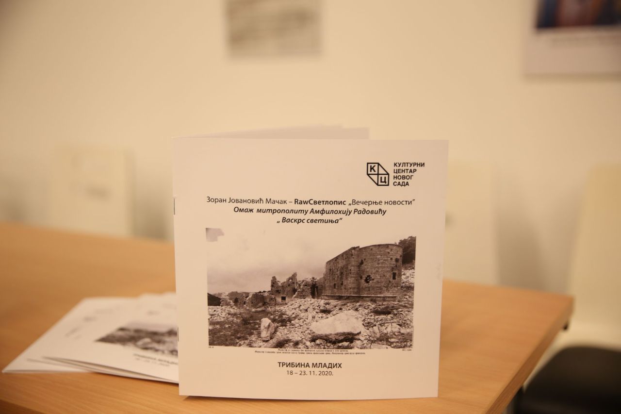 Као омаж недавно преминулом митрополиту Амфилохију Радовићу вечерас је у клубу „Трибина младих“ Културног центра Новог Сада отворена изложба фотографија Зорана Јовановића Мачка. Поред Јовановића на отварању су говорили и Предраг Савић и Гојко Раичевић, аутори пропратних текстова штампаних у каталогу који прати изложбу. Посетиоце је у име Културног центра Новог Сада поздравила и помоћница директора, Сунчица Марковић.