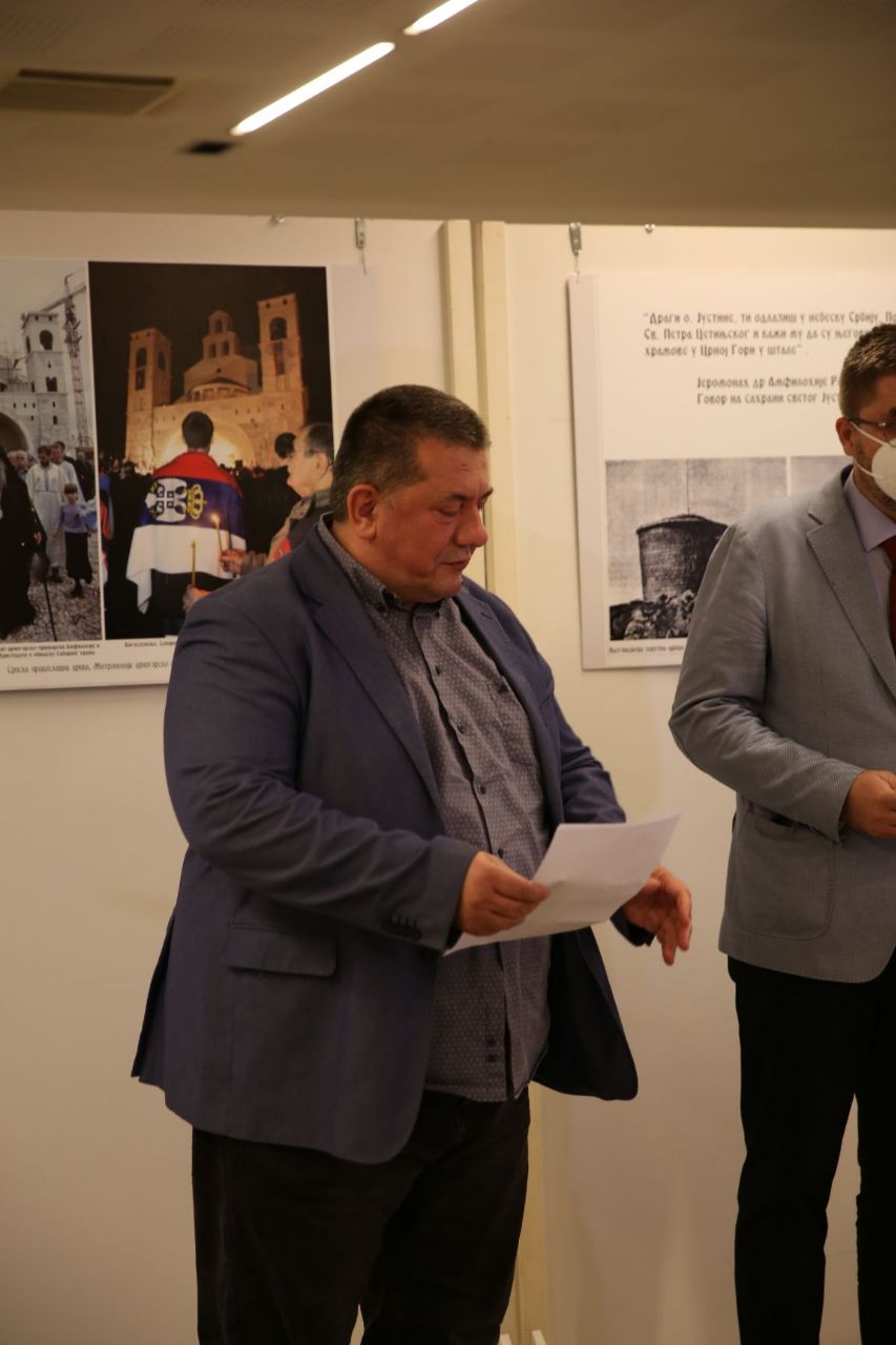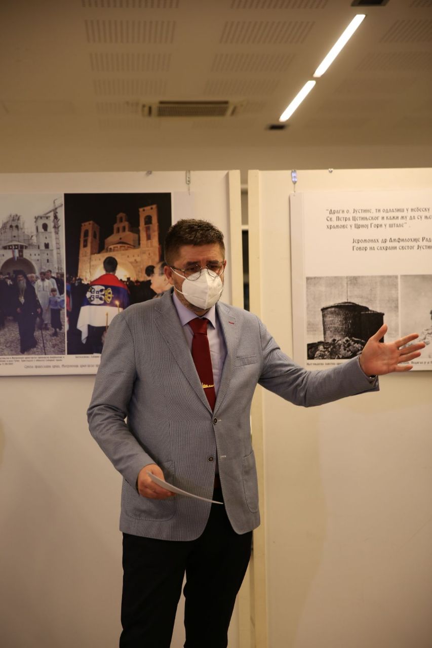 „Захваљујући аутору Зорану Јовановићу данас сведочимо препороду и обнови црногорских светиња. Овај надахнути уметнички израз обавезује и Српску Атину и Српску Спарту. Митрополит Амфилохије је уцртао српски траг у вечности и данас је живљи него икада. Што је био његов глас, данас и довека је заклетва сваког од нас, а као завет који нам је за њим остао јесте обавеза да обновимо капелу на Ловћену“, нагласио је Гојко Раичевић.