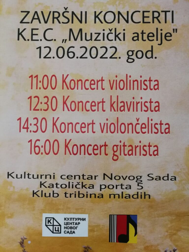 У оквиру програма Културног центра Новог Сада у недељу, 12. јуна 2022. године одржаће се низ концерата полазника „Музичког атељеа“.